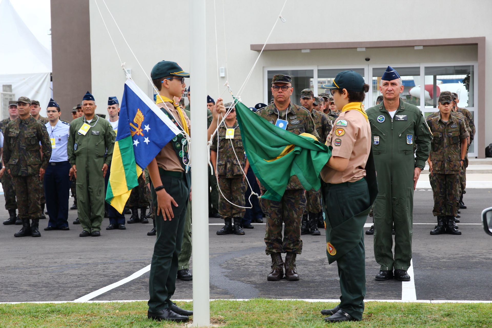 Sob o comando do Tenente-Coronel Especialista em Aviões Oscarino Anthero Junior, que apresentou a tropa ao Brigadeiro do Ar José Aguinaldo de Moura, Coordenador-Geral dos Portões Abertos do DCTA em 2019, a Bandeira Nacional foi hasteada pelo Grupo Escoteiros do Ar Professor Verdussen, marcando o início oficial do evento.