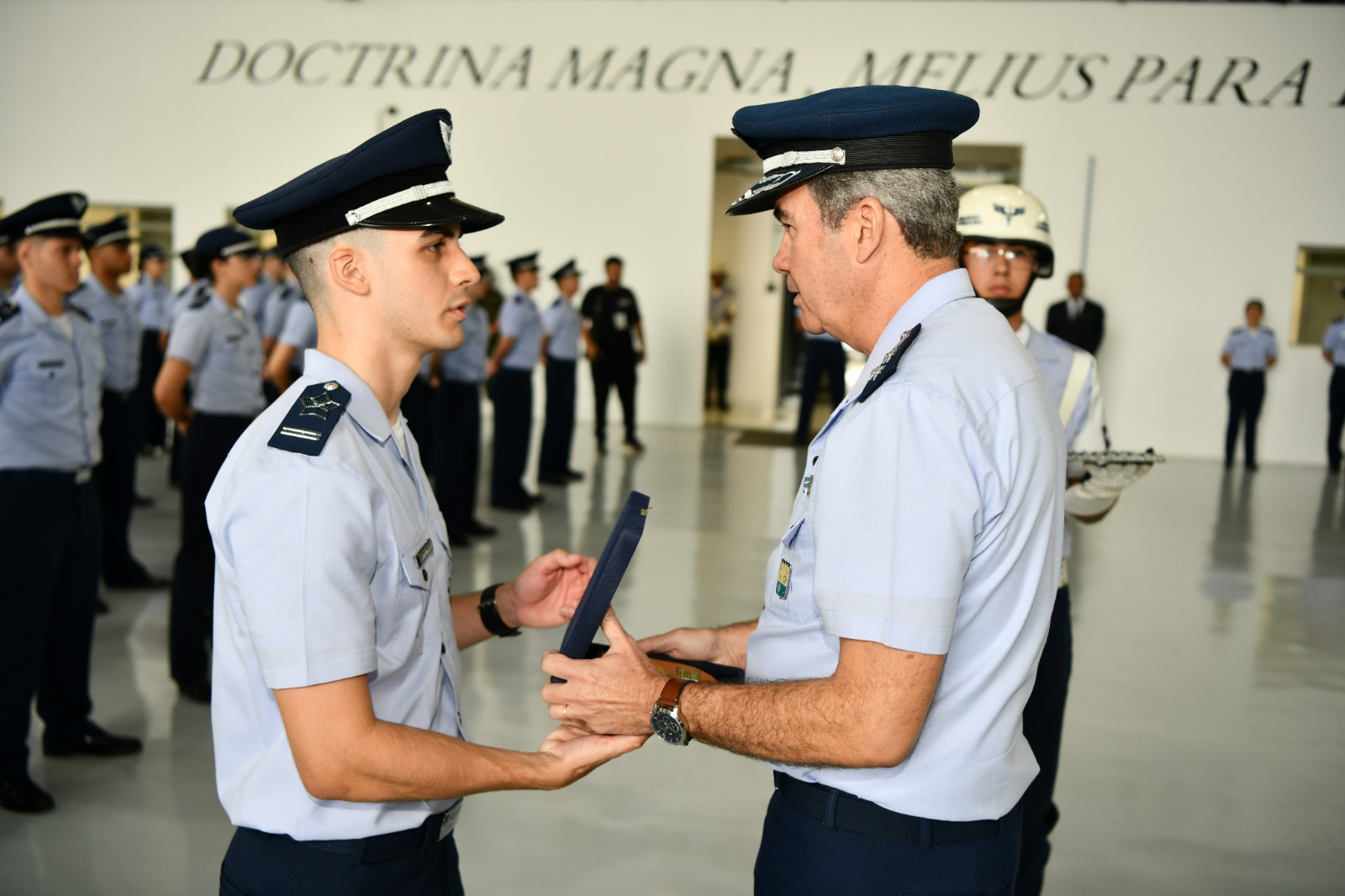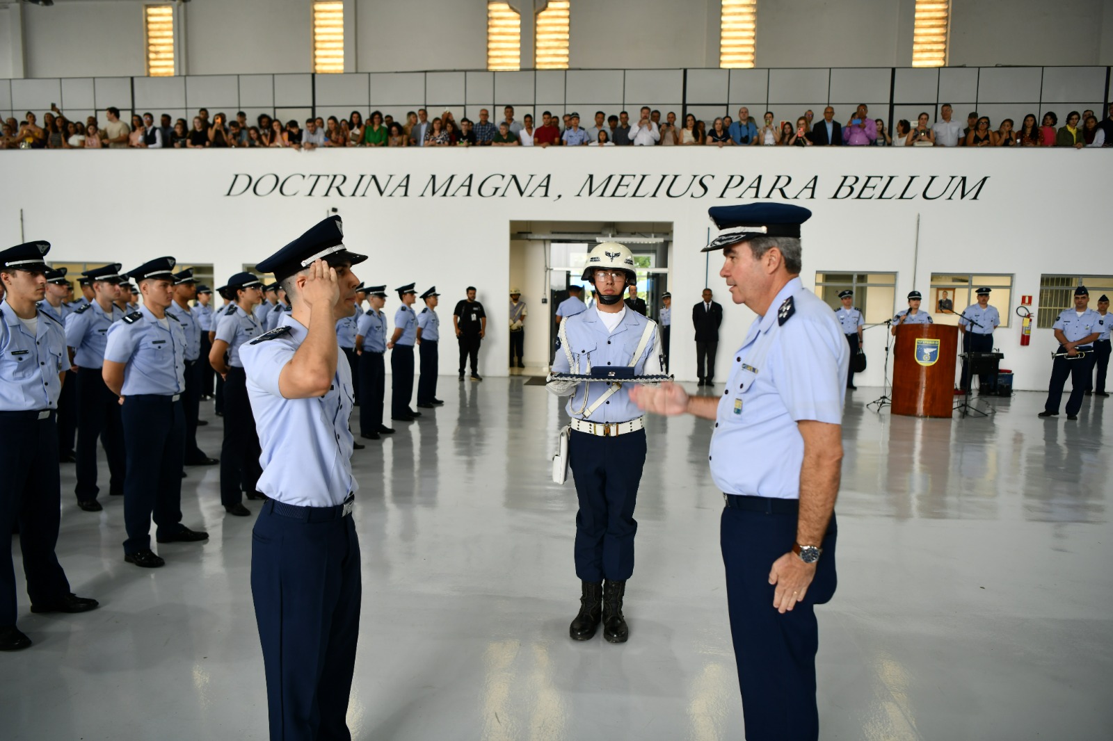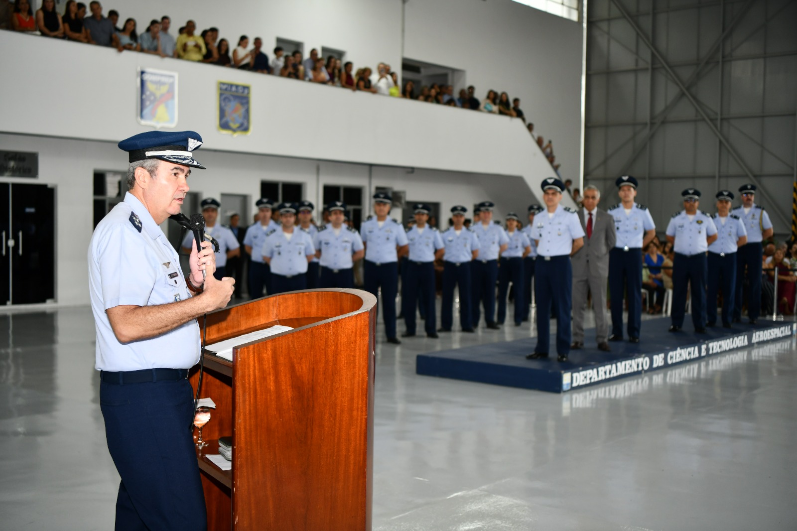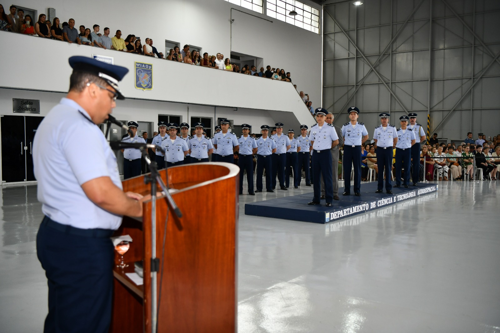 Em suas palavras, o Diretor-Geral do DCTA fez questão de enaltecer o esforço e a dedicação de cada um dos Aspirantes a Oficial, reconhecendo a importância do compromisso e da disciplina que os conduziram até aquele momento de conquista. Além disso, expressou sua sincera gratidão aos pais e familiares dos alunos, destacando o apoio fundamental que ofereceram ao longo de toda a jornada, permitindo que chegassem ao patamar que galgaram hoje.