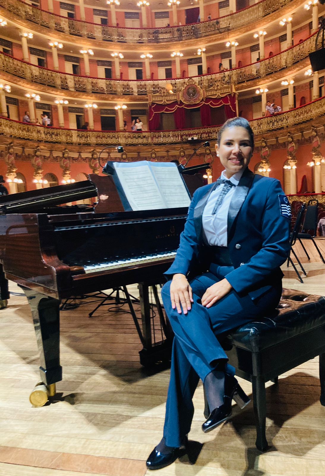 Em 2010, a Sargento musicista ingressou na FAB: “Minha rápida história para estar hoje na OSFAB começou em 2012, onde um antigo chefe que tive na época em que servi no Centro de Instrução e Adaptação da Aeronáutica (CIAAR), o Capitão Músico Haroldo, resolveu me presentear com um xilofone. Eu nunca havia tocado um na minha vida, e ele me impulsionou a aprender para que a orquestra ficasse mais completa para os repertórios eruditos. Com o tempo, e com a ajuda de Deus, ganhei as habilidades necessárias nos mallets, para que meu atual chefe, o Tenente Músico Paulo Rezende, em 2020, me fizesse o convite para compor a cadeira de musicista na OSFAB, não somente para o piano, mas principalmente para os mallets”.