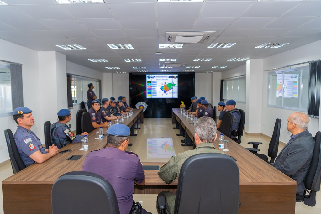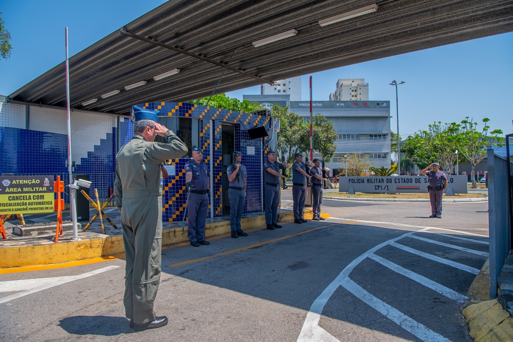 Após receber as Honras Militares, o Diretor-Geral do DCTA, acompanhado pelo Comandante do CPI-1, Coronel da Polícia Militar Luiz Fernando Alves, visitou as instalações e assistiu à apresentação institucional na sala de crise do Centro de Operações da Polícia Militar (COPOM).