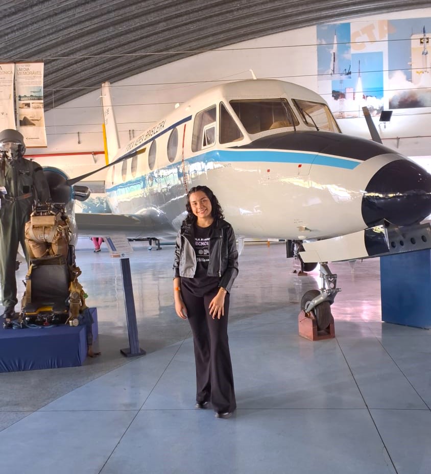 Maria Viviane Laila Silva Santos, da Escola Estadual de Ensino Profissional José Vidal Alves, da cidade de Canindé (CE), vivenciou sua experiência enriquecedora ao visitar o MAB após sua equipe ganhar a medalha de prata na 3° Olimpíada Brasileira de Tecnologia (OBT). Durante a visita, ela expressou seu entusiasmo pelo conhecimento adquirido na área militar, observando mísseis, bombas, aviões e foguetes, e destacou a importância de ver na prática o que aprendeu teoricamente, com as palestras e oficinas. "Para mim, está sendo muito interessante, porque antes eu vivia em uma realidade diferente e não conhecia muito sobre essa parte da tecnologia. É surreal perceber o quão grandiosa é essa área," afirmou Viviane.