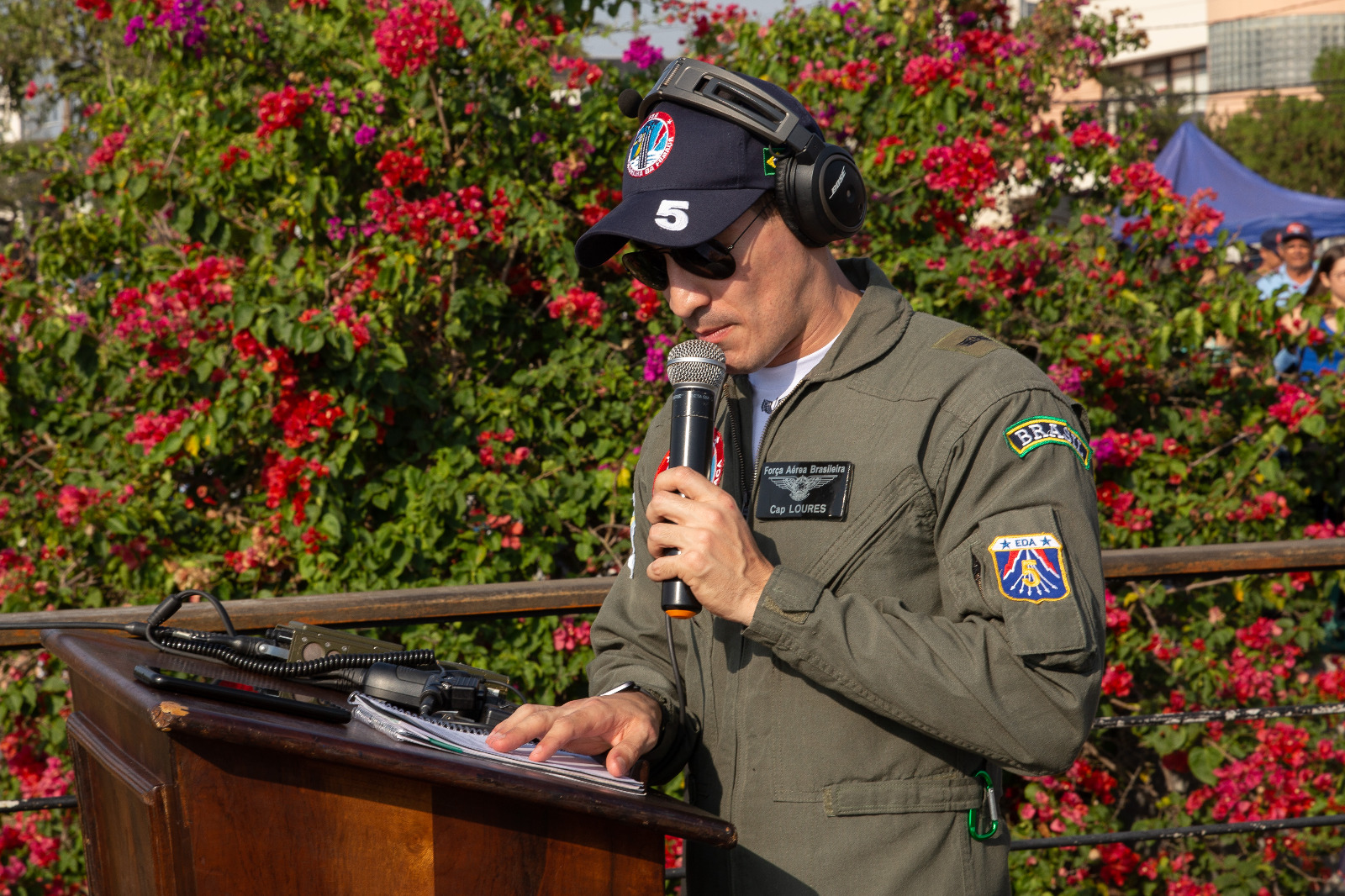 O piloto da EDA, Capitão Aviador Giovanni Loures Guimarães, que foi o locutor do evento, destacou sobre a importância da Esquadrilha para a FAB, além de reforçar a notável relevância deste evento que homenageia o visionário Marechal Casimiro Montenegro Filho.