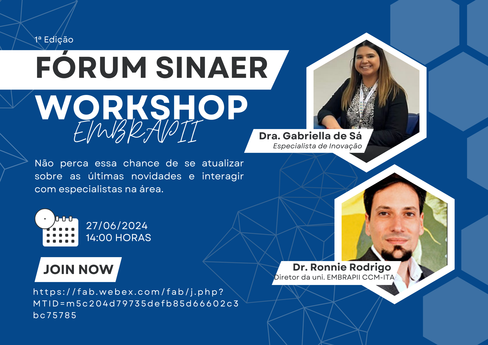 O Fórum SINAER contará com a presença de dois renomados palestrantes. A primeira apresentação será feita pela Especialista de Inovação da EMBRAPII, Doutora Gabriella Maria Silveira de Sá. Sua palestra, intitulada "Apresentação Institucional da EMBRAPII", abordará definições, história, indicadores de projetos e recursos captados, além do plano de metas da organização.