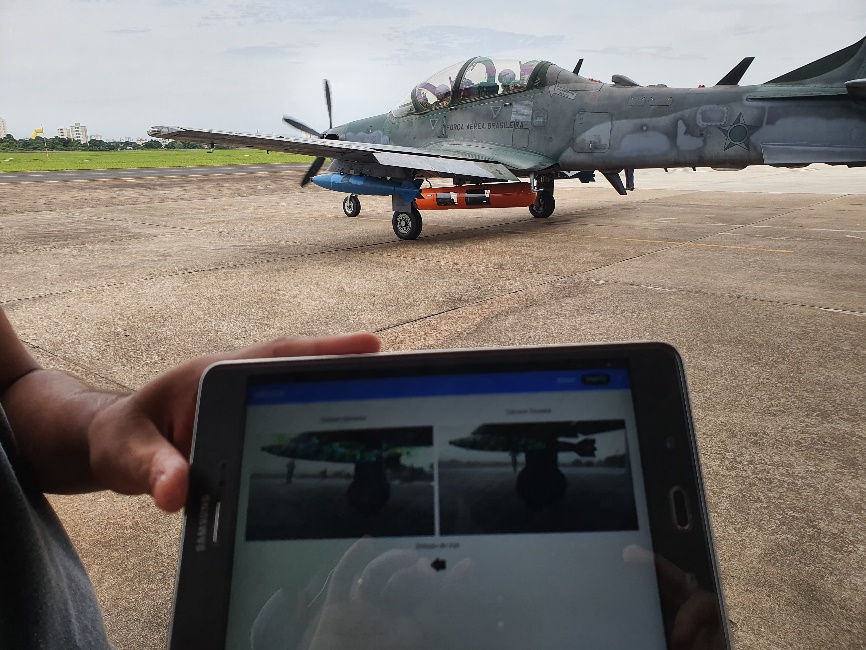 Aeronave A-29 equipada com casulo fotográfico e bombas BAFG-230 inertes, que estão sendo rastreadas em tempo-real pelo SisTrO II