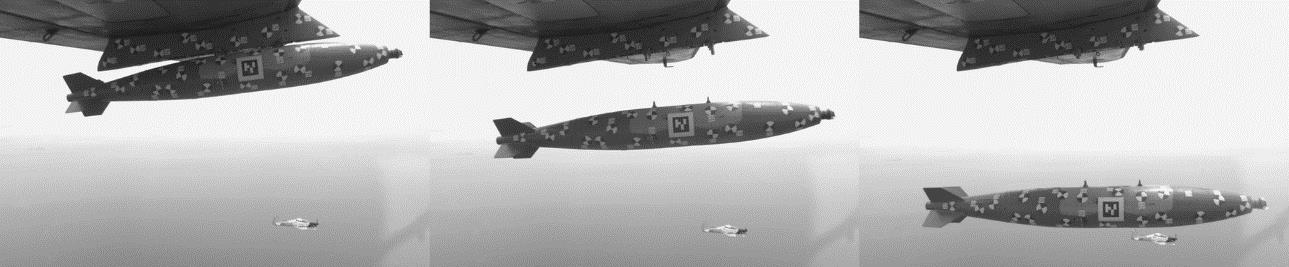Sequência de separação da BAFG-230 nos ensaios em voo com a aeronave A-29, sendo acompanhado por uma aeronave T-27M do IPEV