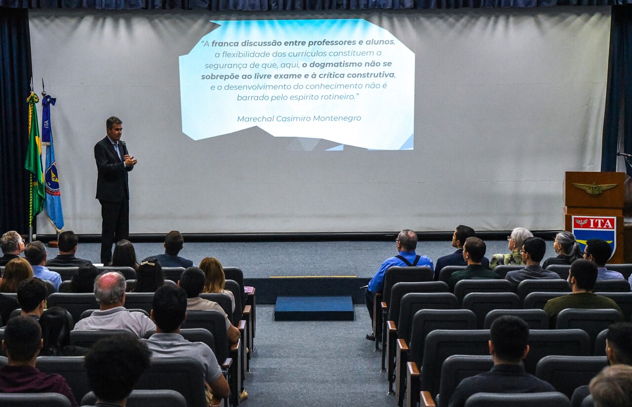 Durante sua fala, o Tenente-Brigadeiro Medeiros apresentou detalhes sobre o relatório final da Comissão Multiministerial que avaliou a instalação de um novo campus do ITA em Fortaleza (CE). Foram apresentadas perspectivas de cursos a serem oferecidos, a projeção da quantidade de alunos matriculados e informações sobre a contratação de professores e técnicos para a implementação do projeto. “Nós carregamos em nossa estrutura genética o DNA da inovação, uma característica que remonta desde quando Santos Dumont inovou com o avião, passando pela criação do Bandeirante, o primeiro carro a álcool do Brasil desenvolvido no ITA, até os resultados atuais, como a fabricação do KC-390 e a produção do Grippen. É nessa linha que estamos buscando inovar para criar um novo campus dessa Instituição de Ensino Superior tão consagrada que é o ITA”, apontou.