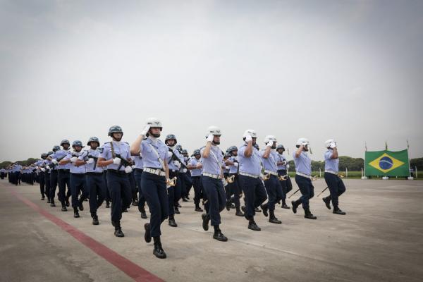 A tropa desfilou ao som da canção do Primeiro Grupo de Aviação Embarcada e da canção Bandeirantes do Ar, músicas que vibram coragem, qualidade essencial para os engenheiros enfrentar novos desafios em prol da missão da Força Aérea Brasileira.