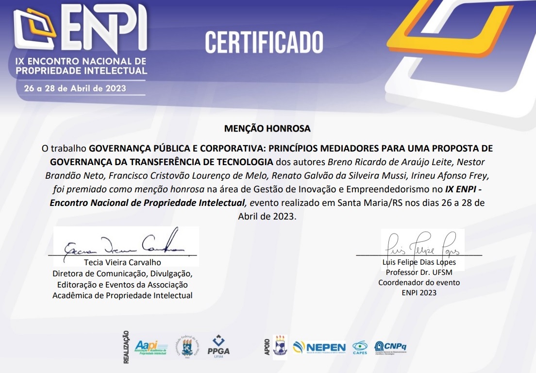 Realizada de 26 a 28 de abril a 9ª edição do Encontro Nacional de Propriedade Intelectual (ENPI) em Santa Maria (RS), o evento contou com a participação dos congressistas de forma presencial e por videoconferência. O ENPI é um evento científico de abrangência nacional realizado anualmente, que reúne os maiores especialistas do país em temas ligados à propriedade intelectual, transferência de tecnologia, gestão da inovação e empreendedorismo.