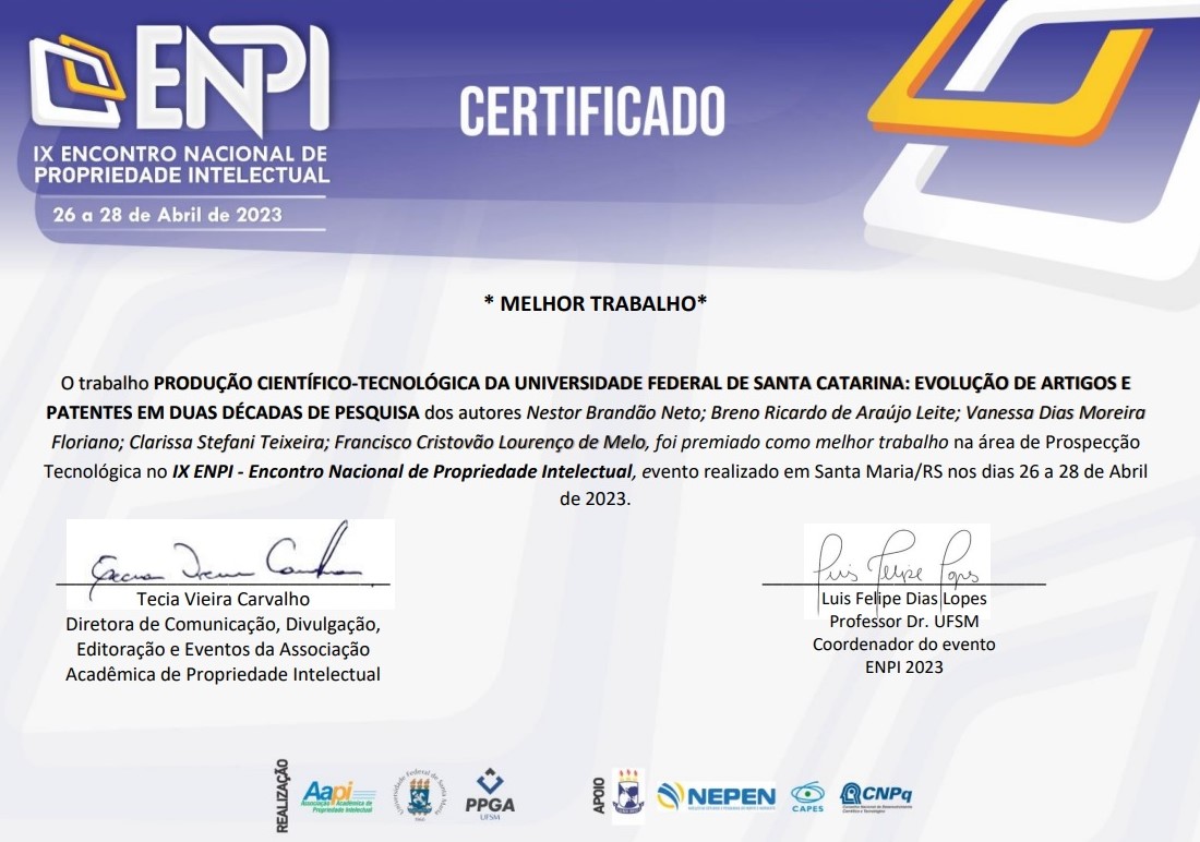 Foram agraciados com o “Prêmio de melhor trabalho na sessão Prospecção Tecnológica”, com o título “Produção científico tecnológica da Universidade Federal de Santa Catarina: evolução de artigos e patentes em duas décadas de pesquisa”, os seguintes pesquisadores: o Tenente-Coronel Aviador Breno, do DCTA; o Tecnologista Renato Mussi, do DCTA; a Sargento QSCon Vanessa Dias, do Centro de Lançamento de Alcântara (CLA); o Analista C&T Nestor, do Instituto de Estudos Avançados (IEAv) e pesquisador Francisco, do Instituto Tecnológico de Aeronáutica (ITA).