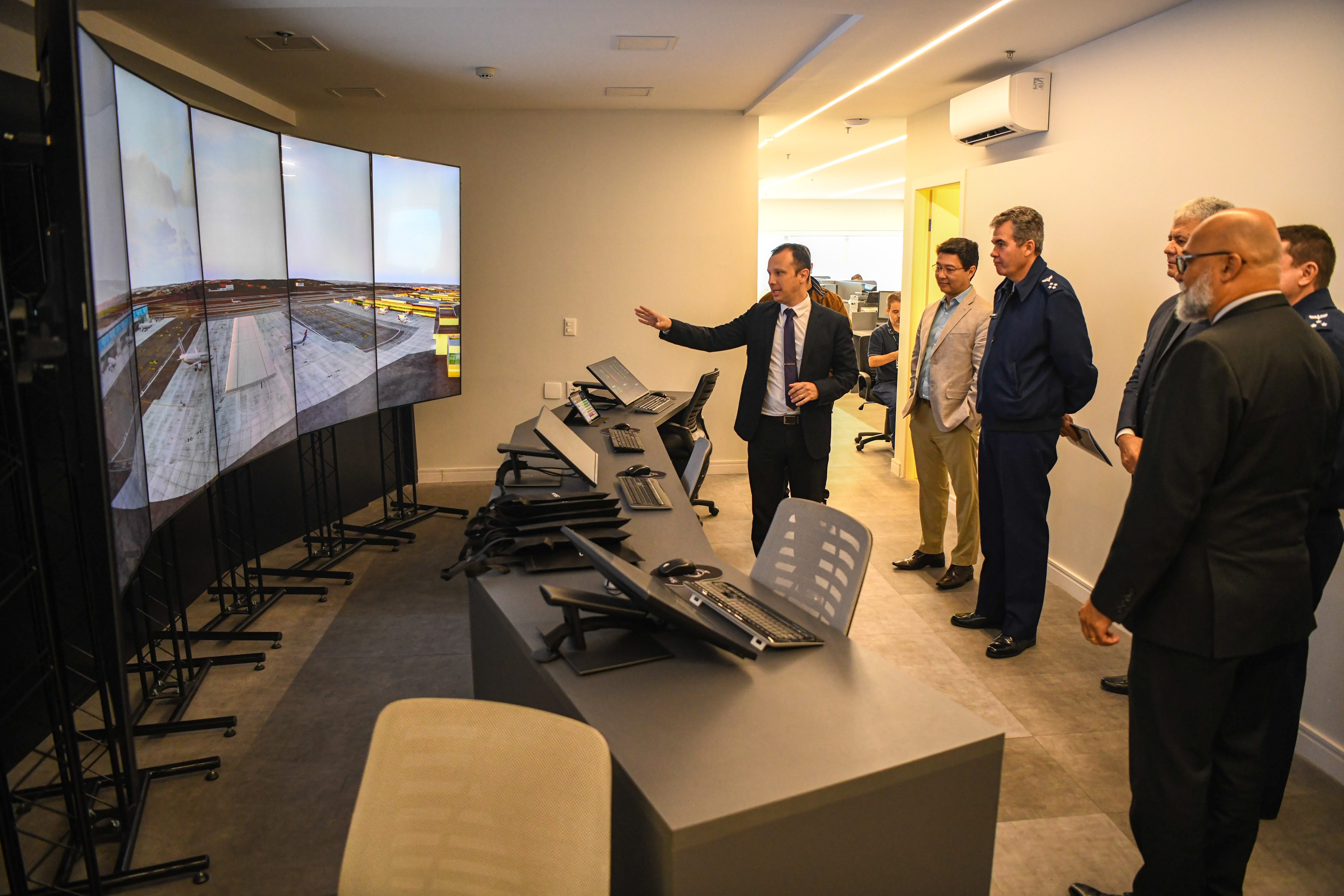 Após as apresentações, a comitiva do DCTA seguiu para visitar o espaço destinado ao simulador de torre TATIC 3D SIM, uma solução desenvolvida para atender às necessidades de capacitação e treinamento de controladores de tráfego aéreo. O produto simula o movimento de aeronaves e equipes de solo em um aeródromo, permitindo que os ATCOs (controladores de tráfego aéreo) pratiquem e aprimorem suas capacidades técnicas, em diferentes cenários.