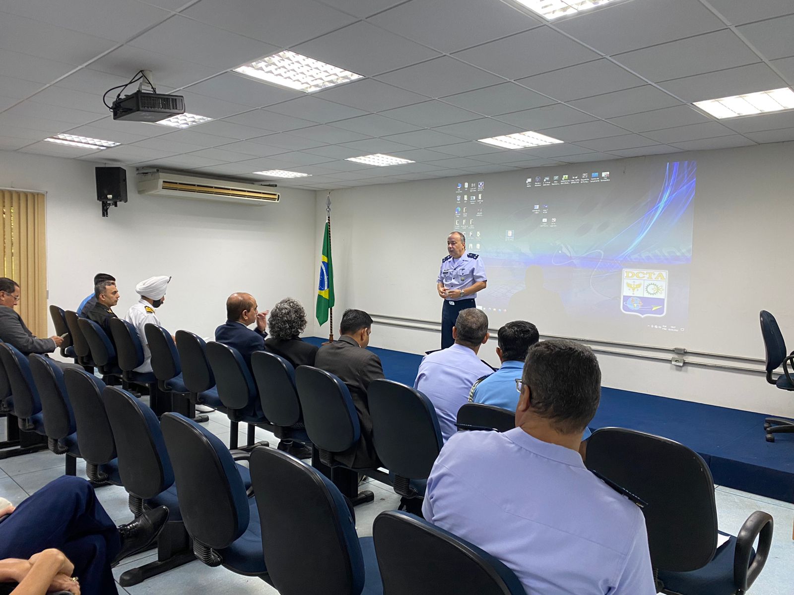 Após as palavras de boas-vindas, a comitiva assistiu a uma palestra institucional ministrada pelo Chefe do Escritório Corporativo de Gerenciamento de Projetos do DCTA, Coronel Aviador Manuel Antônio de La Sagra Fagundes Pérez, com enfoque principal nos diversos benefícios que as tecnologias desenvolvidas nos institutos do DCTA trouxeram para a nossa sociedade.