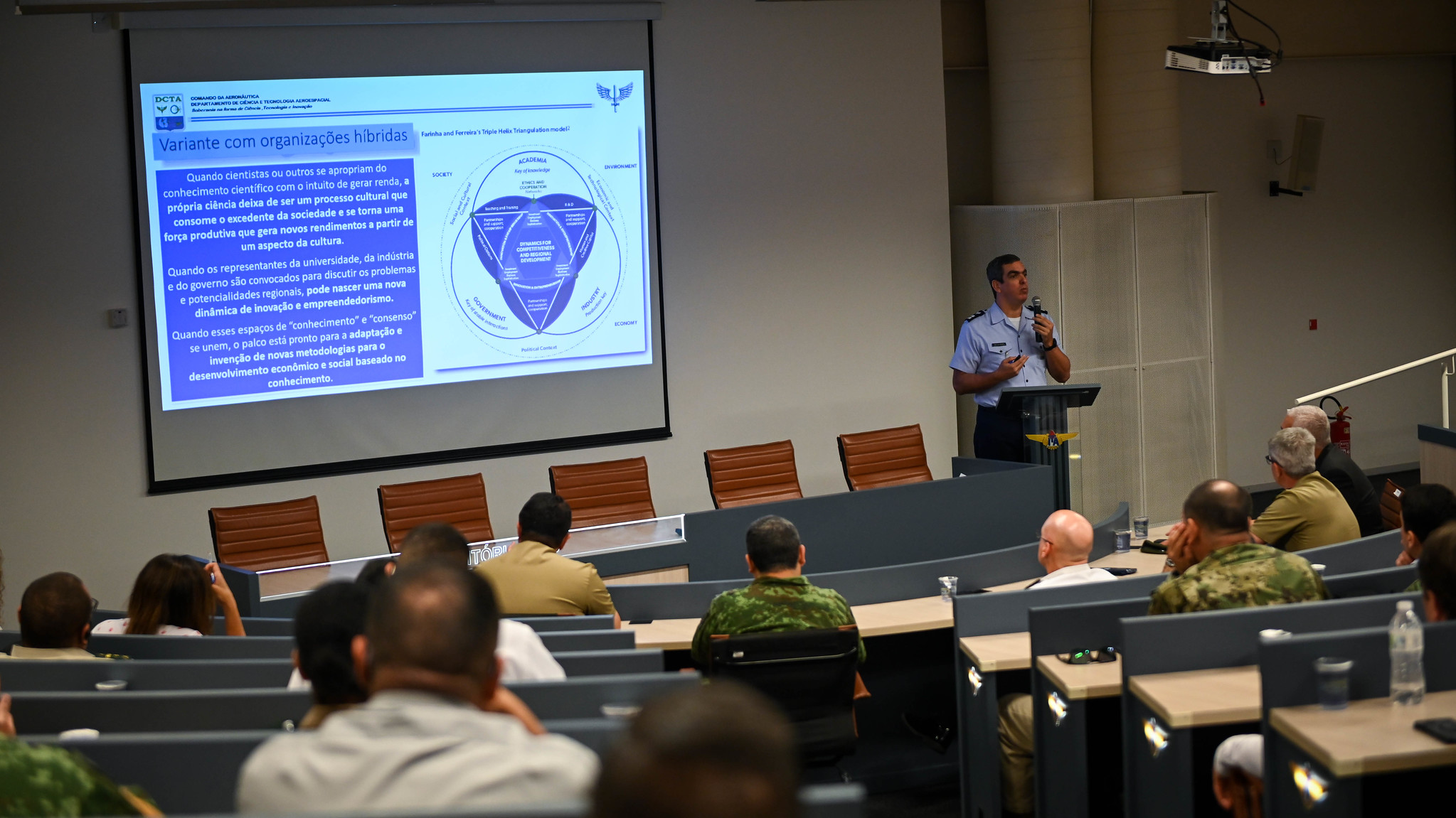 Durante a manhã, o grupo participou da palestra institucional com o Chefe do Escritório Corporativo de Gerenciamento de Projetos do DCTA, Coronel Aviador Manuel Antônio de La Sagra Fagundes Pérez. Para o Coronel La Sagra, a visita do CID foi uma excelente oportunidade para discutir pontos importantes sobre o modelo da Tríplice Hélice, que consiste na inter-relação de três elementos: as empresas, as universidades e o governo, pilares que servem como impulsionadores da inovação.