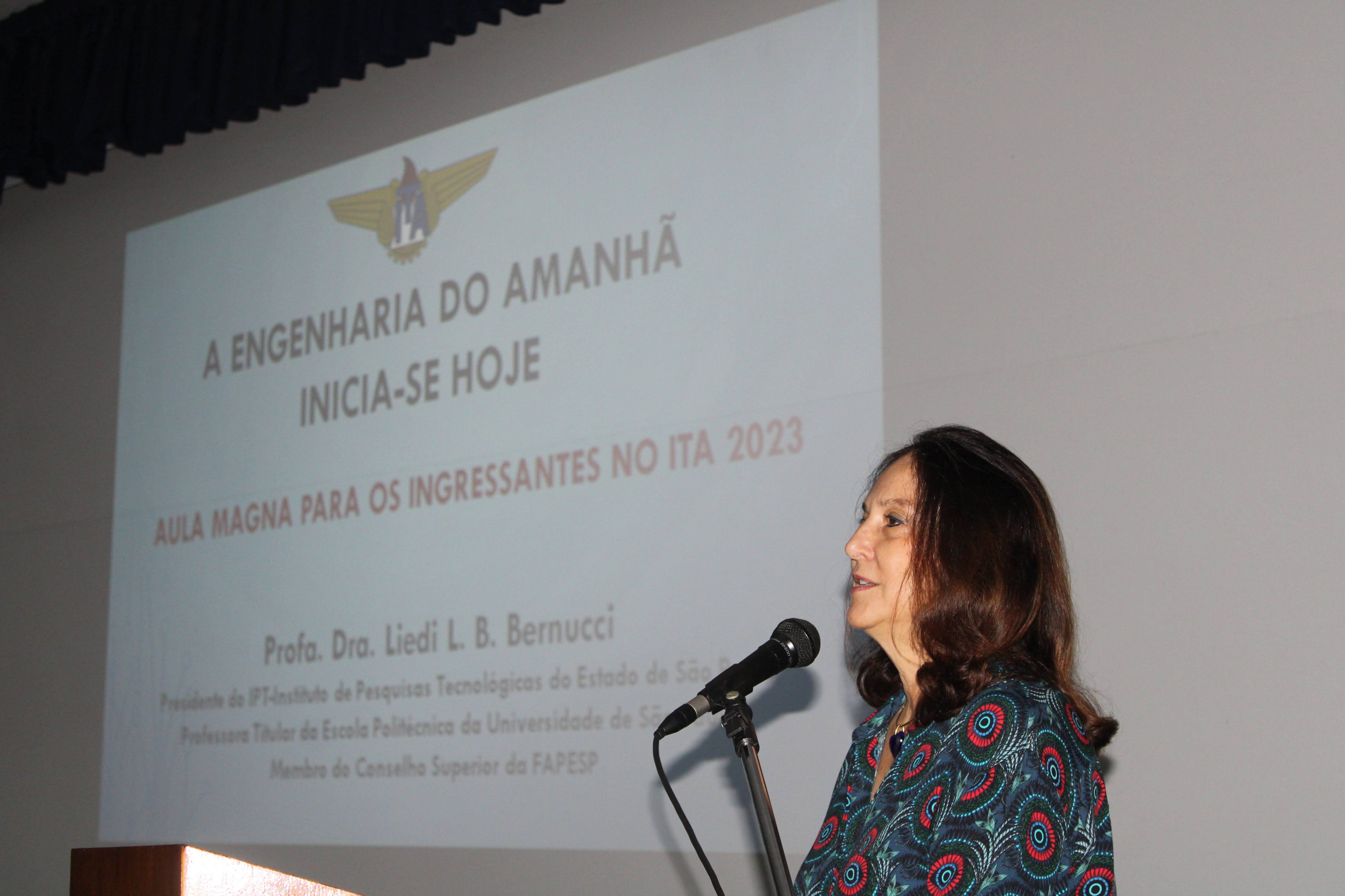 A presidente do Instituto de Pesquisas Tecnológicas do Estado de São Paulo (IPT) e membro do Conselho Superior da Fundação de Amparo à Pesquisa do Estado de São Paulo (FAPESP), Professora Doutora Liedi Legi Bariani Bernucci, foi a palestrante convidada. Primeira mulher a ministrar uma Aula Magna na história do ITA, possui graduação em Engenharia Civil pela escola politécnica da Universidade de São Paulo, mestrado em Engenharia Geotécnica, também pela USP, e doutorado em Engenharia de Transportes de forma conjunta pela Universidade de São Paulo e pelo Instituto Federal de Tecnologia de Zurique, na Suíça.