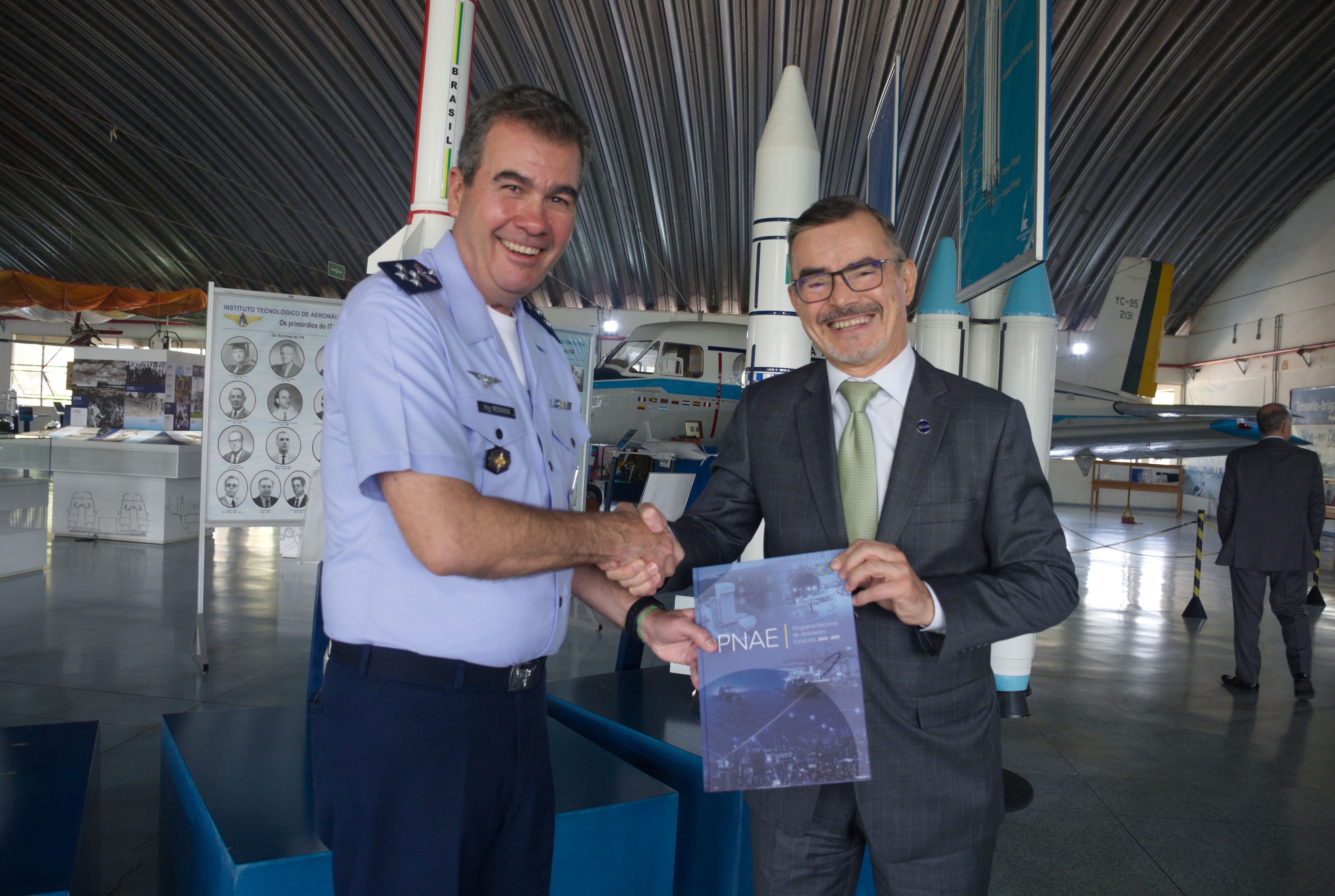 Na ocasião, o Presidente da AEB, Carlos Moura, entregou ao Tenente-Brigadeiro Medeiros, o Programa Nacional de Atividades Espaciais (PNAE) para o período de 2022 a 2031.