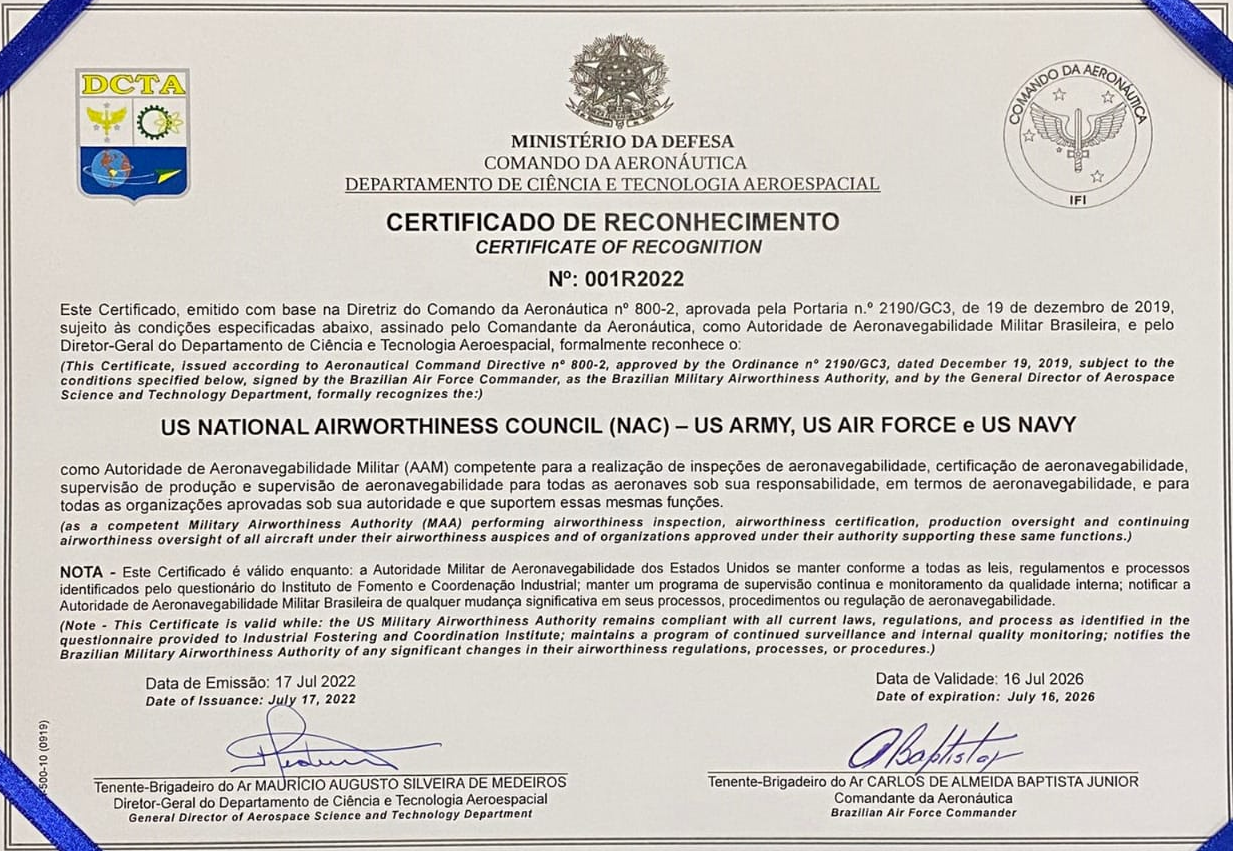 A Força Aérea Brasileira (FAB) e o National Airworthiness Council (NAC), órgão dos Estados Unidos da América (EUA) que reúne as autoridades técnicas de aeronavegabilidade militar da US Air Force, US Navy e US Army (Força Aérea, Marinha e Exército dos EUA, respectivamente), assinaram a revalidação dos certificados de reconhecimento de Autoridade de Aeronavegabilidade Militar (AAM), proporcionando a manutenção da validação mútua de atividades de inspeção, certificação, produção e aeronavegabilidade continuada de produtos e sistemas aeroespaciais sob responsabilidade dos dois países.