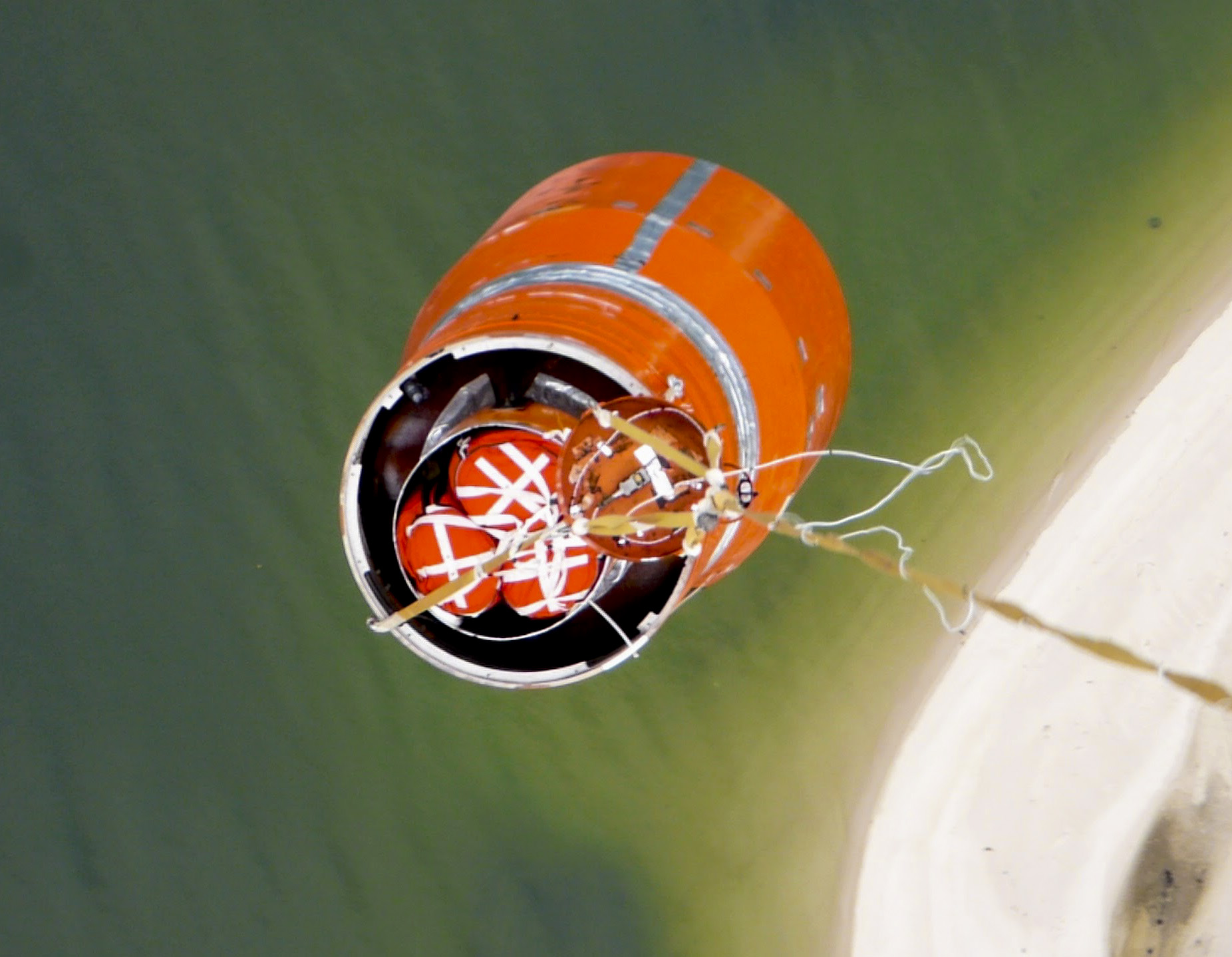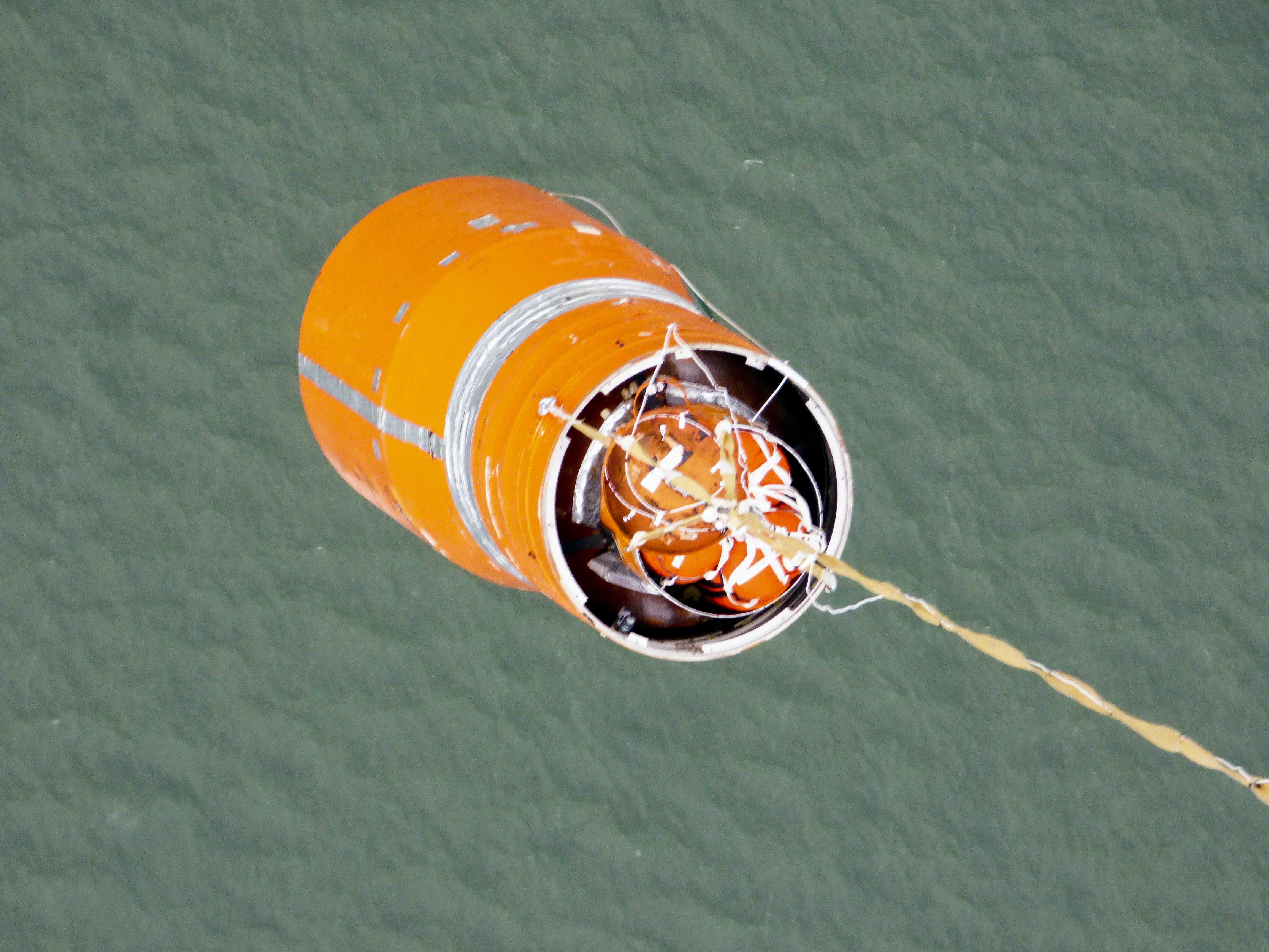 A velocidade terminal do mockup PSR induzida pela ação PQD Principal foi da ordem de 10 m/s até o impacto na água. Importante salientar que o mockup PSR é hermético, sendo capaz de manter sua flutuabilidade durante toda a fase de resgate no mar.
