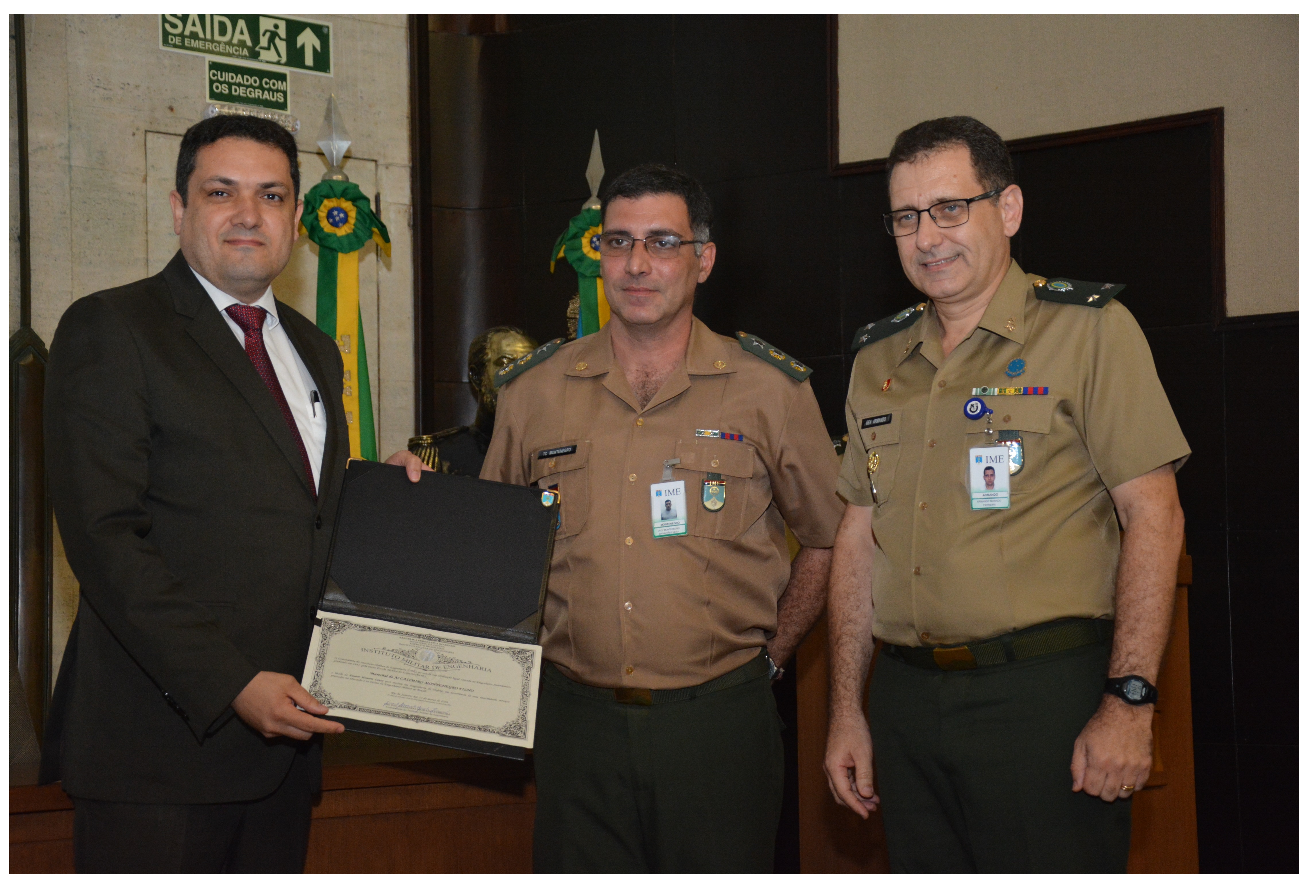 “É uma imensa honra e responsabilidade segurar as mãos o único título Honoris Causa da história do IME”, declarou o Reitor do ITA. Foi concedido pela primeira vez no IME o título de Doutor Honoris Causa post mortem ao Marechal do Ar Casimiro Montenegro Filho que foi entregue ao Reitor do ITA para compor o acervo do Instituto.