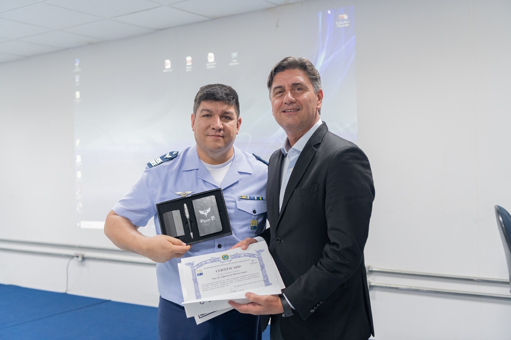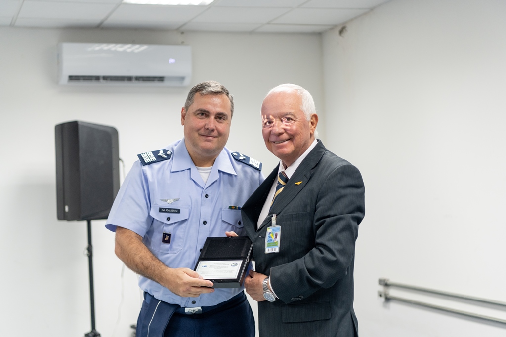 Posteriormente, o Brigadeiro Venâncio Alvarenga Gomes e o Chefe da CGOV realizaram a entrega de uma placa comemorativa em reconhecimento às inovações tecnológicas desenvolvidas e destacando o mérito e a relevância dessas conquistas para o avanço científico.